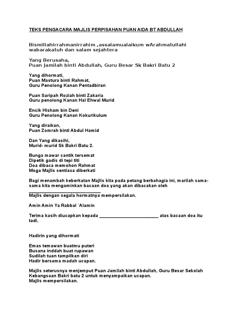 Daun layu di tengah gurun, nampak jalur pohon cemara, tradisi melayu turun menurun, pantun ditutur pembuka bicara. Teks pengacaraan majlis persaraan docx teks pengacara majlis sempena persaraan timbalan pengarah masa 1 50 ptg cue ketibaan pendidik ann . Teks pengacara majlis perpisahan puan aida bt abdullah. Teks pengacara majlis perpisahan en.